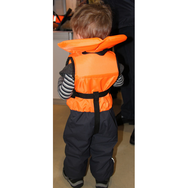 Детский спасательный жилет "Юнга-М" предназначен для детей весом до 20 кг. По возрасту подходит детям от 1 до 3 лет. Жилет оборудован удобным подголовником для поддержания головы на воде. В походном положении подголовник не мешает ребенку. Под подголовником расположена петля для удобной и быстрой подтяжки ребенка к себе. Застегивается жилет на замок-молнию и 2 ремня с фастексами, двумя шнурками на воротнике и снизу жилета. Для того, чтобы при падении в воду, жилет не слетел с ребенка - он оборудован паховой стропой. Для хорошей видимости в темное время суток на плечах и подголовнике расположены светоотражающие полосы. Спинка наполнена наполовину. В районе поясницы жилет пустой, в районе лопаток - с наполнителем. Данное расположение наполнителя гарантирует точное положенние ребенка в воде лицом вверх.